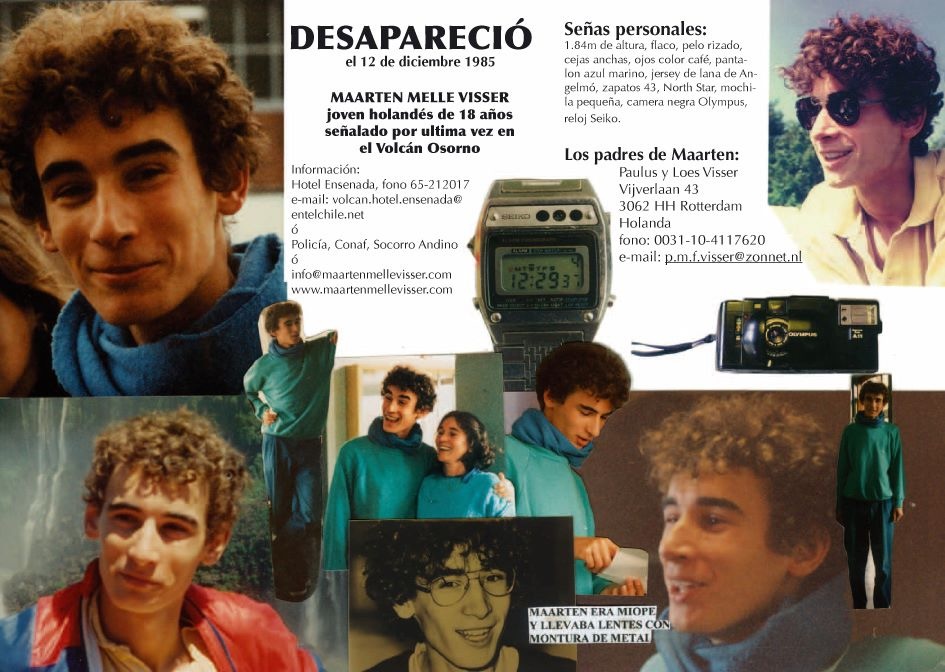 –Su hijo ha desaparecido en Chile. Nadie sabe dónde está desde el 12 de diciembre –les explicó uno de los agentes, en referencia a Maarten Melle Visser, el hijo de 18 años del matrimonio, que medio año antes, luego de egresar de la enseñanza media, decidió recorrer un poco el mundo, antes de ingresar a la universidad.