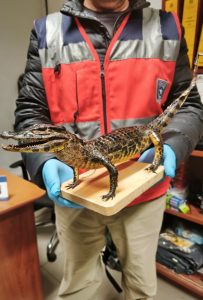 “Al momento de la revisión, los funcionarios se percataron de la presencia de un objeto extraño dentro del equipaje”, informaron desde ADUANAS. Al abrir la caja, confirmaron que se trataba de un yacaré bebé disecado.