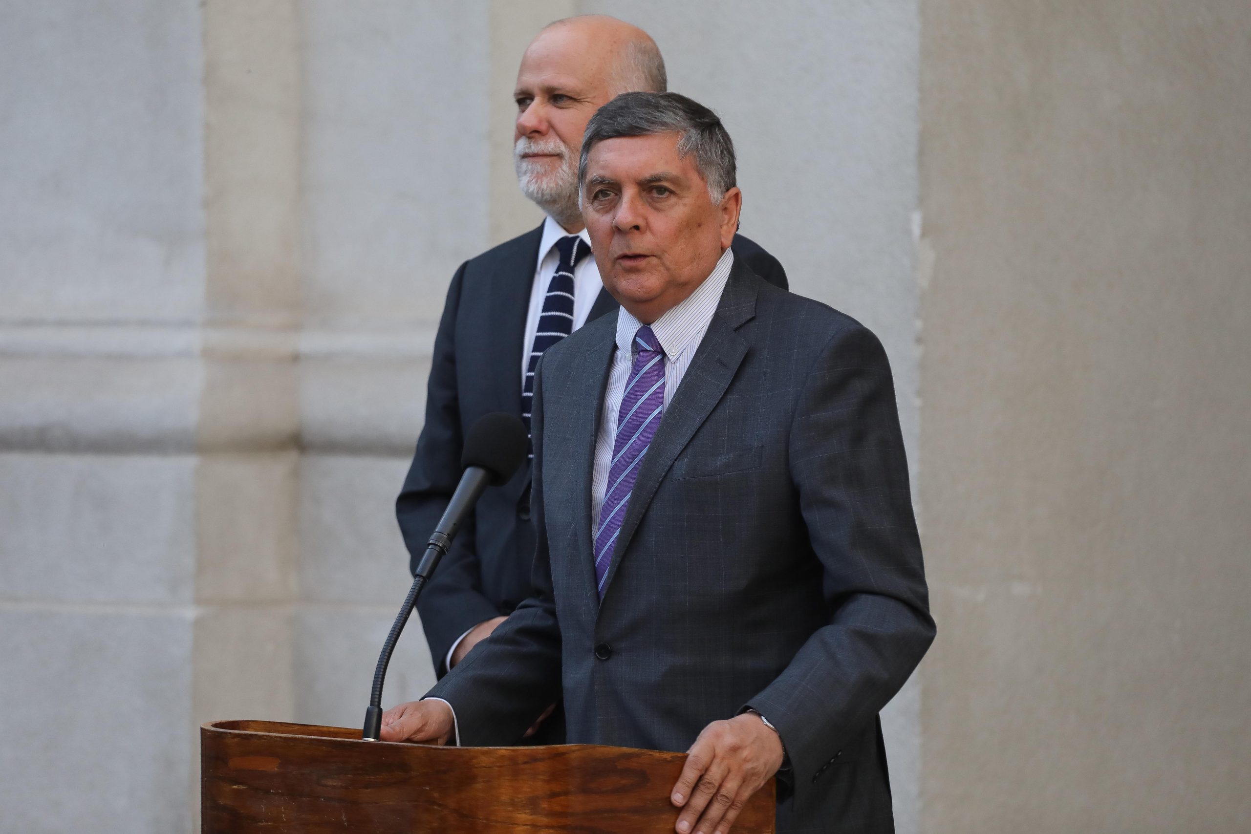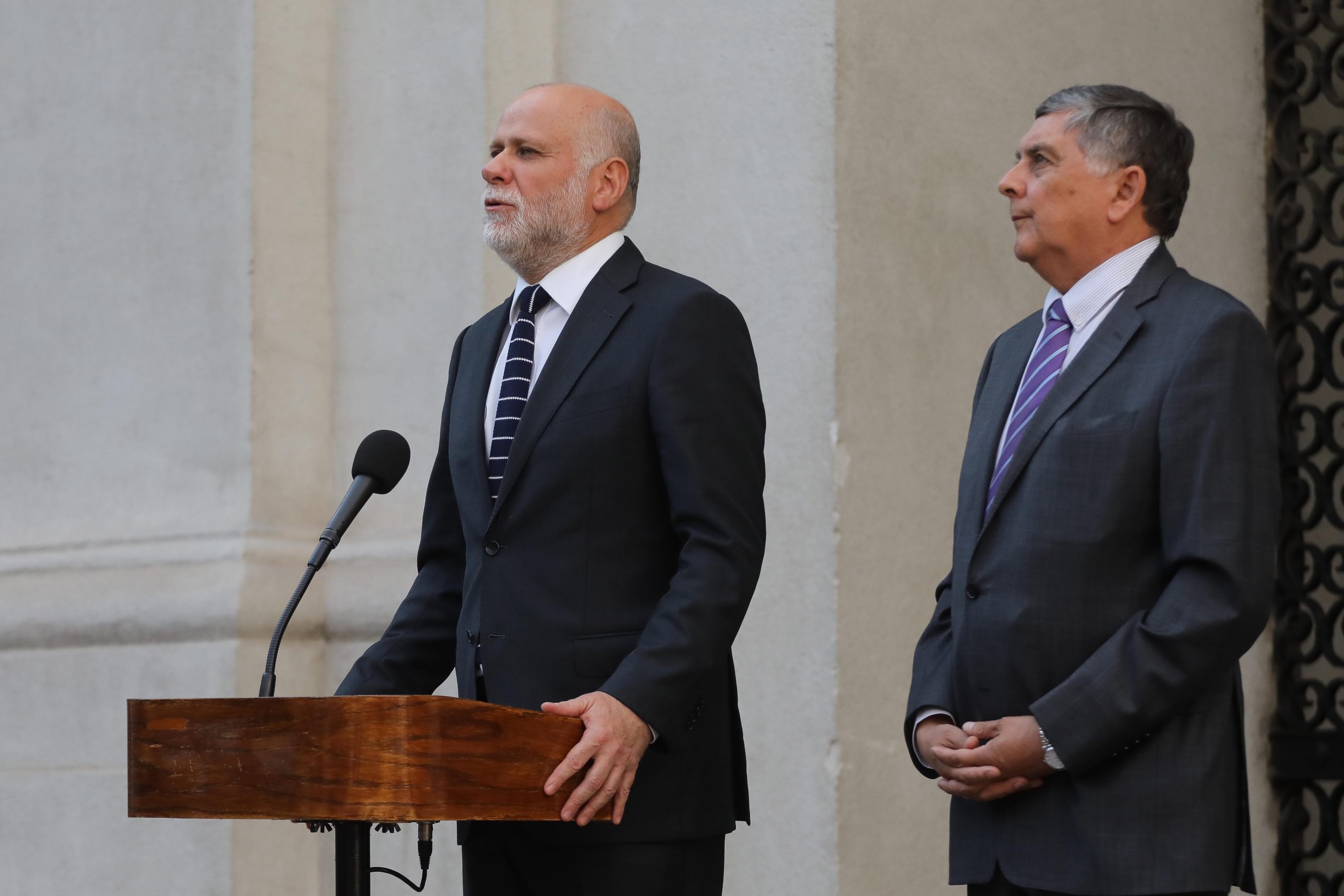 El ministro del Interior, Alvaro Elizalde, junto al ministro del Interior entrante, Claudio Alvarodo, realizan un punto de prensa en el patio de Los Naranjos del Palacio de La Moneda, tras una reunion de trabajo, para facilitar los trspasas de la cartera.