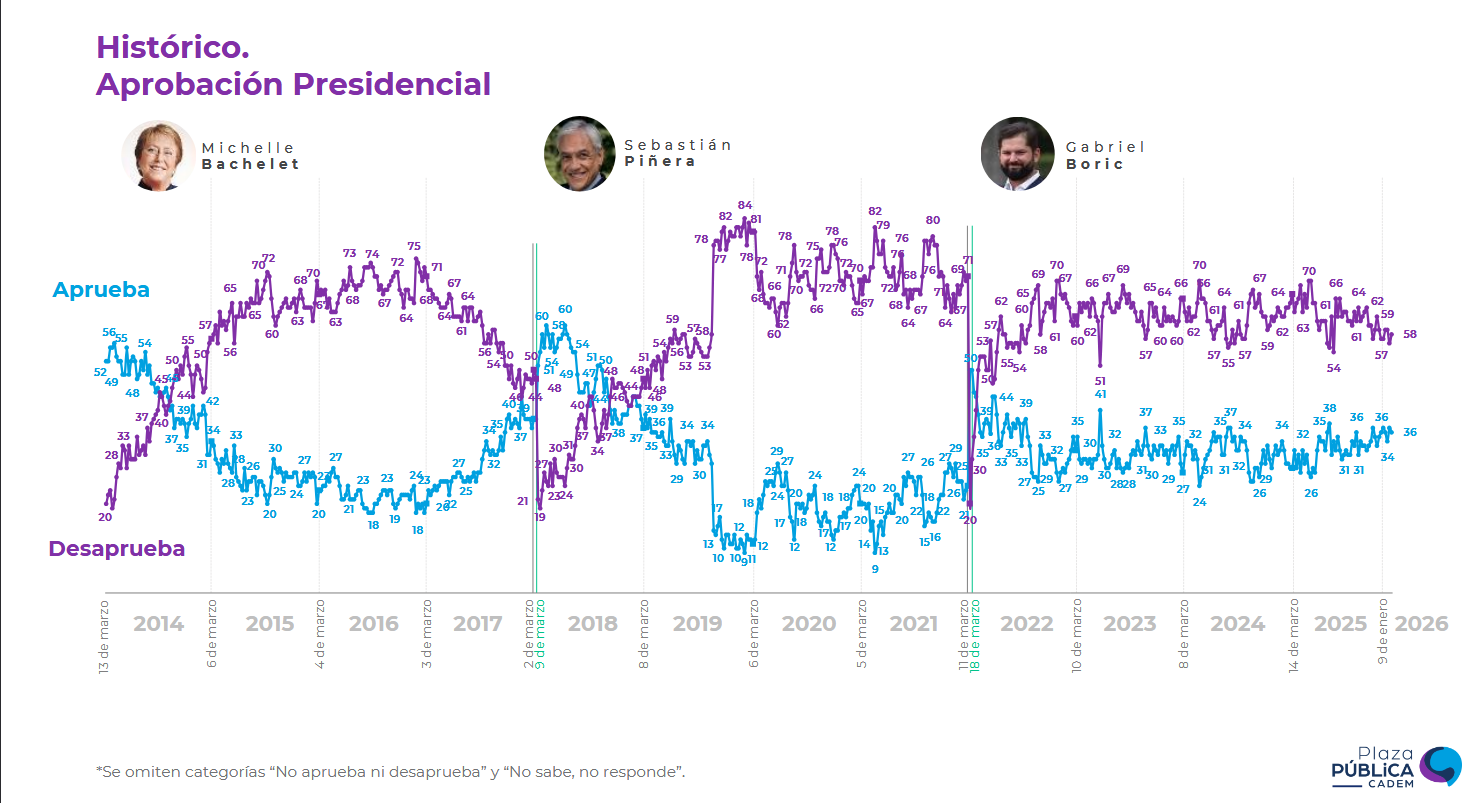 Paralelamente, la evaluación del gobierno del Presidente Boric se mantiene en niveles bajos, con un 36% de aprobación y un 58% de desaprobación. Los ministros mejor evaluados son Jaime Pizarro (Deporte) con un 60%, el canciller Alberto van Klaveren con un 55% y Álvaro Elizalde (Interior) con un 48%. En contraste, el peor evaluado es Nicolás Cataldo (Educación) con un 24%. Las ministras Carolina Arredondo y Antonia Orellana registraron las caídas más pronunciadas en su evaluación.