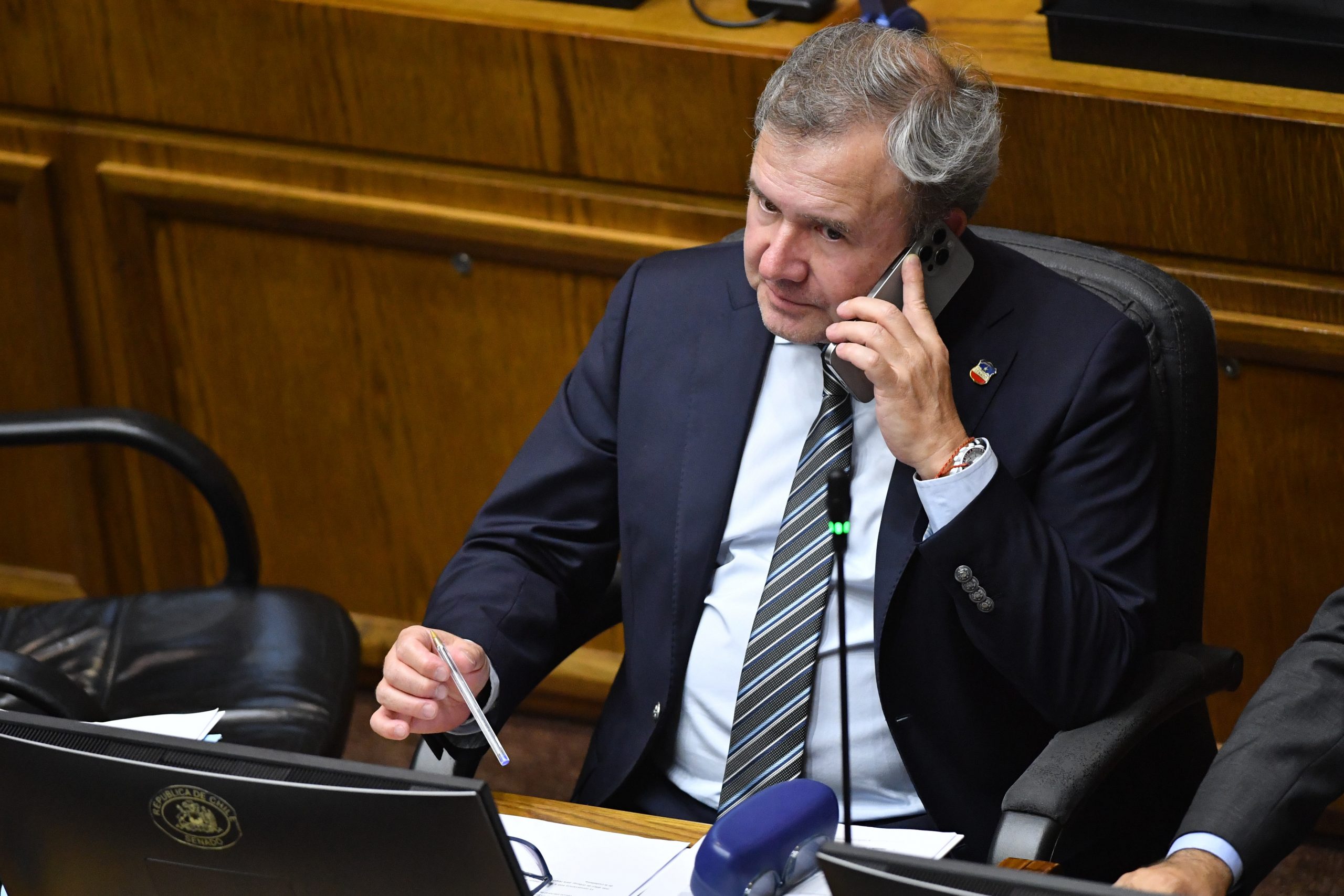 El senador Gustavo Sanhueza habla por telefono en el hemiciclo durante la sesión en sala del senado.