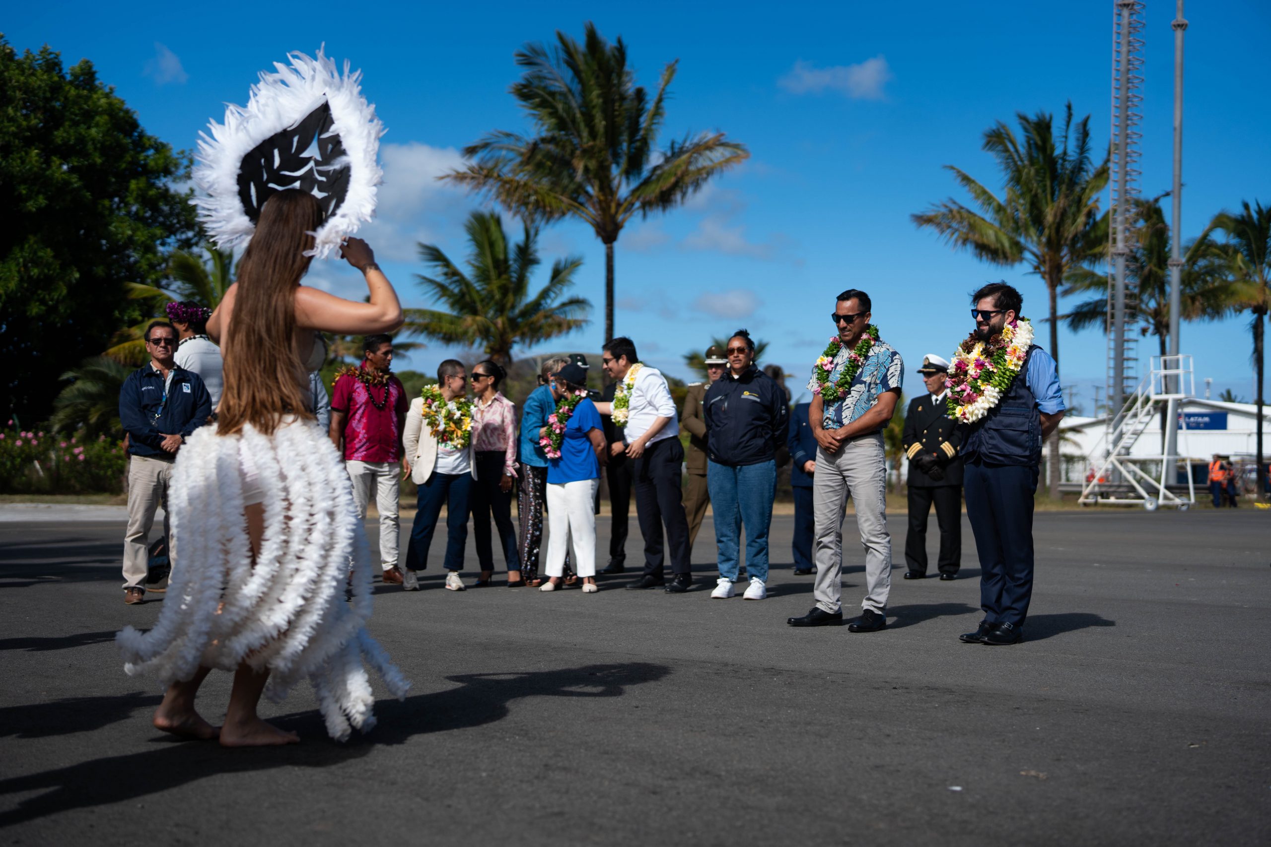 Gabriel Boric descendió del avión de la Fuerza Aérea minutos antes de las 18:00 horas locales (20:00 continentales), donde fue recibido con el tradicional karone tiare (collar de flores) y una muestra del baile sau-sau, instancia en la que se sumó a bailar por un momento junto a los locales.