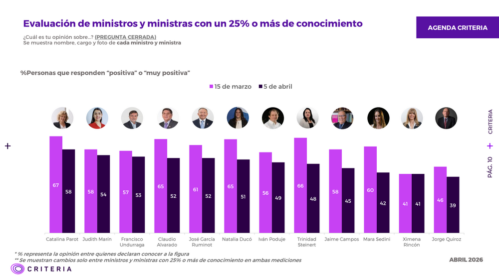 En el gabinete, la mayoría de los ministros muestra un aumento en su nivel de conocimiento respecto de la medición del 15 de marzo. Entre las figuras más reconocidas se ubican Ximena Rincón (79%), Natalia Ducó (72%), Mara Sedini (63%), Iván Poduje (56%) y Jorge Quiroz (51%).