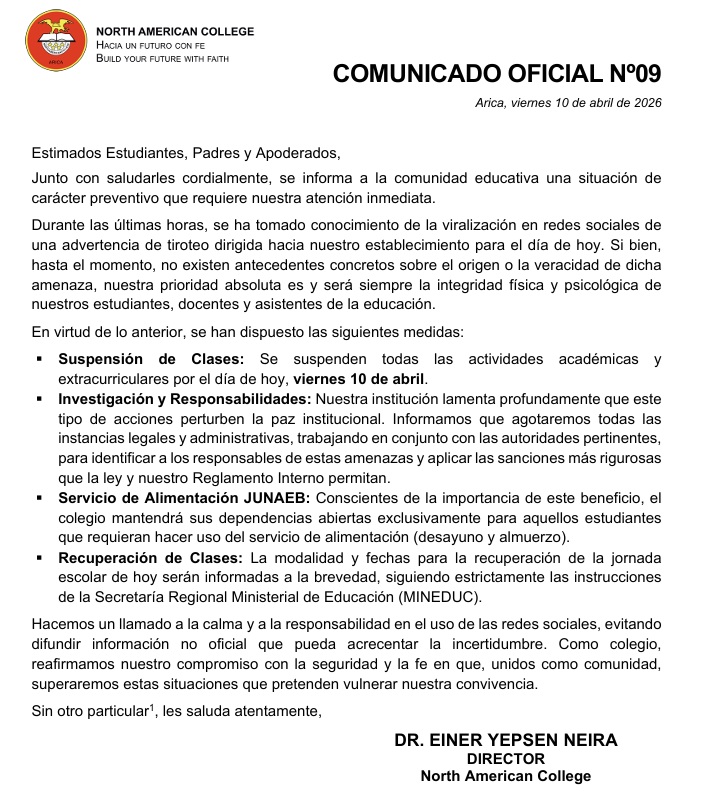 La viralización de mensajes a través de redes sociales con una amenaza de tiroteo sobre el Colegio North American College, hizo que la plana directiva del establecimiento educacional tomara la decisión de suspender las clases por hoy.