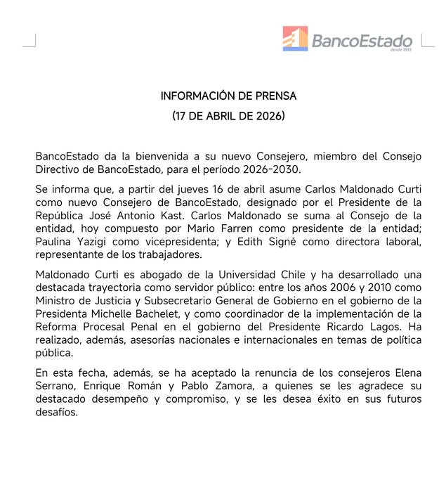 “BancoEstado da la bienvenida a su nuevo Consejero, miembro del Consejo Directivo de BancoEstado, para el período 2026-2030. Se informa que, a partir del jueves 16 de abril asume Carlos Maldonado Curti como nuevo Consejero de BancoEstado, designado por el Presidente de la República José Antonio Kast”, señaló la institución en un comunicado.