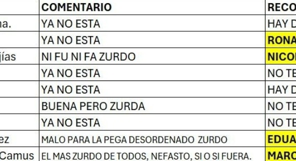 Entre las expresiones contenidas en la planilla figuraban frases como “ni fu ni fa zurdo”, “buena pero zurda” o “el más zurdo de todos, nefasto, sí o sí fuera”, además de recomendaciones de reemplazo bajo la categoría “Nuestra gente”.