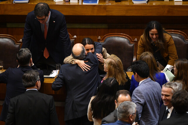 La ministra Maria Paz Arzola es abrazada por el diputado Sergio Bobadilla posterior a la votación.