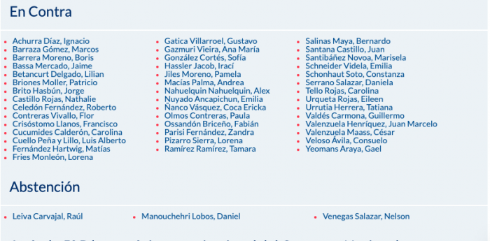 En el desglose político, el Frente Amplio, el Partido Comunista y el PDG votaron mayoritariamente en contra, aunque con excepciones puntuales. En el PDG, el diputado Javier Olivares y su par, Cristian Contreras —Dr. File— se desmarcaron y respaldaron la iniciativa. En el PS, en tanto, se registraron abstenciones relevantes —Raúl Leiva, Daniel Manouchehri y Nelson Venegas—, reflejando que el tema también abrió dudas dentro de la centroizquierda.
