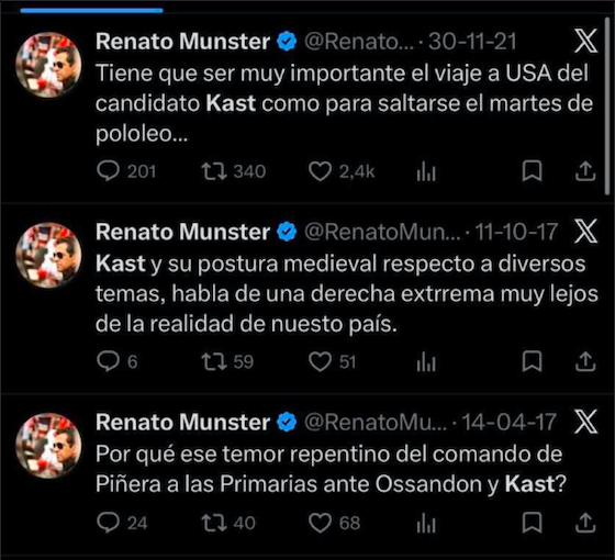 En medio de tanta tensión, la salida exprés de Renato Münster de la Seremi de las Culturas de la RM dejó en evidencia una total falta de elenco para completar los cargos de gobierno. Aunque en su caso, la salida correspondió a que no cumplía los requisitos como tener título profesional (es egresado de teatro) mucha gente se quedó con la idea de que se debió a unos posteos publicados en contra de Kast. Si fuera aquello no es el único, en la arqueología tuitera resucitamos una serie de episodios previos, donde otros personajes que sí permanecen en el Gobierno fueron tanto o más feroces en atacar al actual Presidente.