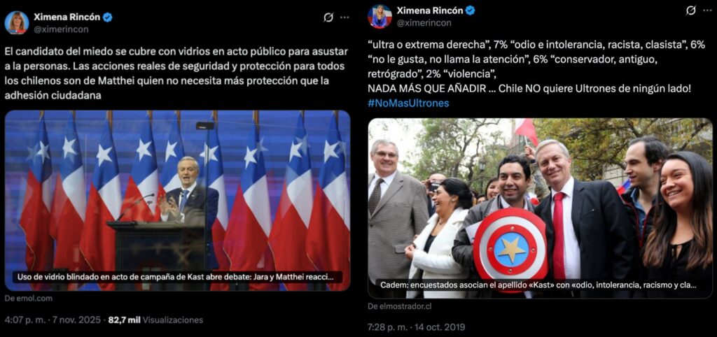 La hoy ministra de Energía no fue precisamente tibia en campaña: trató a Kast de “vendehúmo”, lo acusó de privilegiar los eslóganes por sobre propuestas y le pegó por ausencias en debates. En X, lo emplazó por el vidrio blindado y lo encasilló en la “ultra o extrema derecha”. El Mandatario, eso sí, no se guardó nada contra Rincón.