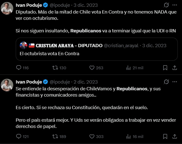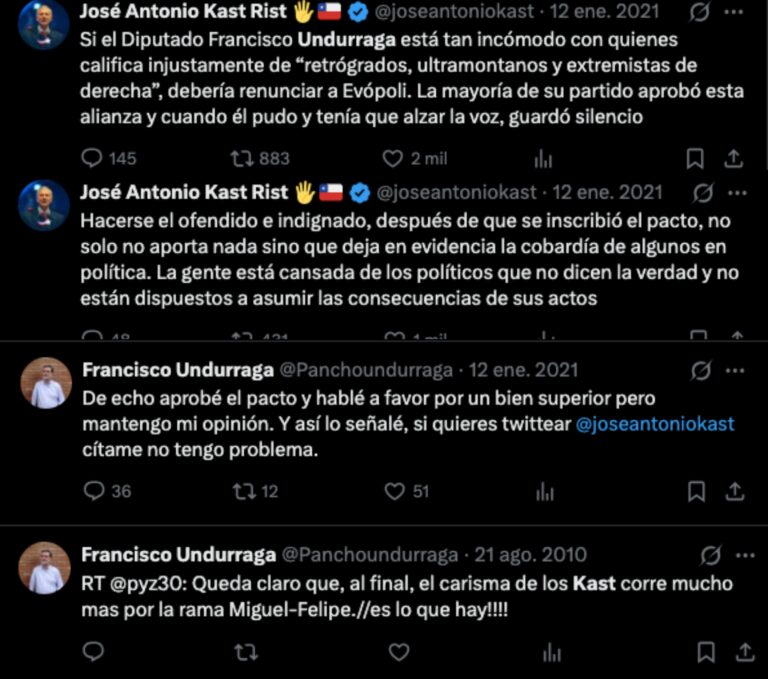 En 2024, en televisión, el entonces candidato municipal dijo clarito que Kast “no está a la altura de los desafíos modernos”, que era “muy conservador” y que sus declaraciones alimentaban polarización. Spoiler: hoy es ministro. Después, él mismo sinceró el giro: “Declaración desafortunada”. Quizás por eso el titular de Vivienda optó por cerrar su cuenta en X, pero hay algunos pantallazos, varios con críticas a Republicanos durante el proceso constitucional.
