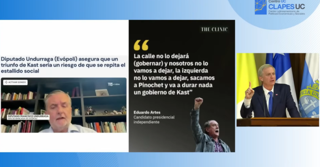 El Mandatario también le contestó. En el foro de Clapes UC, el entonces candidato citó a Undurraga sosteniendo que el único “estallido” real fue el de 2019 bajo el Gobierno que él respaldó, es decir, de Sebastián Piñera. La siguiente es la diapositiva en la que Kast adjuntó una captura de pantalla para responderle.