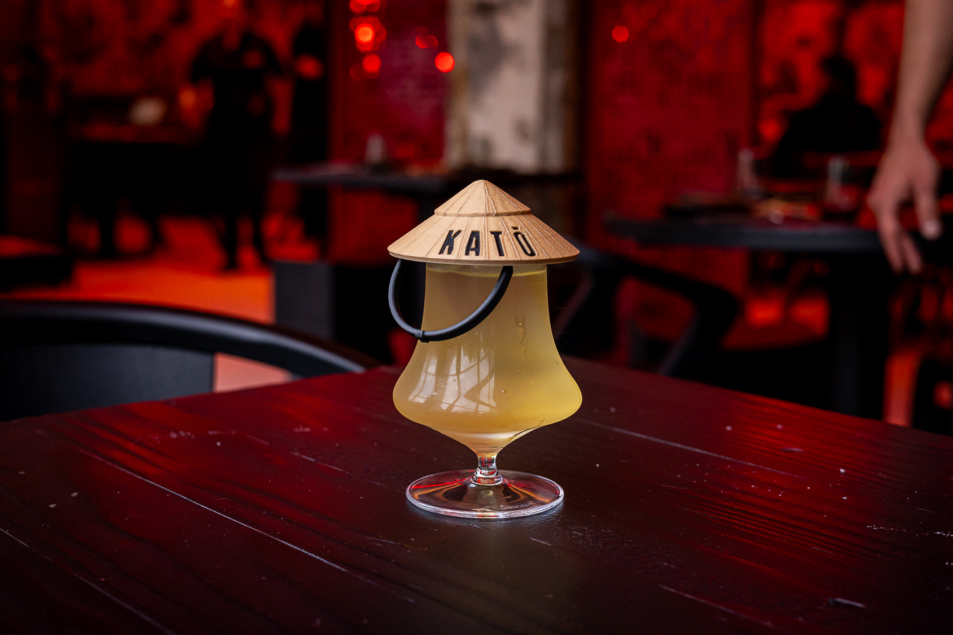 El espacio ha sido remodelado para ser visualmente llamativo y funcional, con una buena terraza y varias mesas en el interior, además de algunas sillas en la barra para disfrutar los diferentes cócteles de la carta. El lugar cuenta con iluminación en tonos rojos y mobiliario negro que crean un ambiente intrigante, visible incluso desde la calle. Y un lindo mural de Javier Barriga —de esas figuras femeninas de espaldas— calza perfecto con la identidad de Kató.