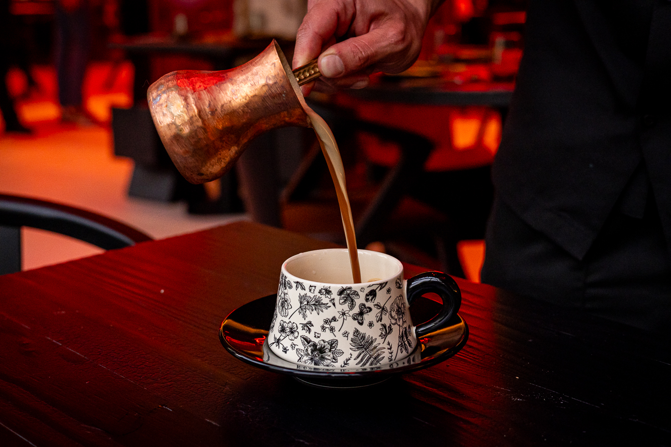 Para cerrar, conocimos el Osaka Midnight, que contiene whisky japonés, licor de café, syrup de café, café turco y aceite de sésamo negro. Aunque es una reinterpretación del Espresso Martini, tan de moda, la presentación —en una taza junto al ibrik— ya llama la atención. El sabor, menos dulce que el clásico espresso (algo que se agradece), se aleja de lo convencional. El aceite de sésamo, junto al café achocolatado, da la impresión de saborear un postre de mousse de chocolate con aceite de oliva y sal: perfecto para cerrar una cena.