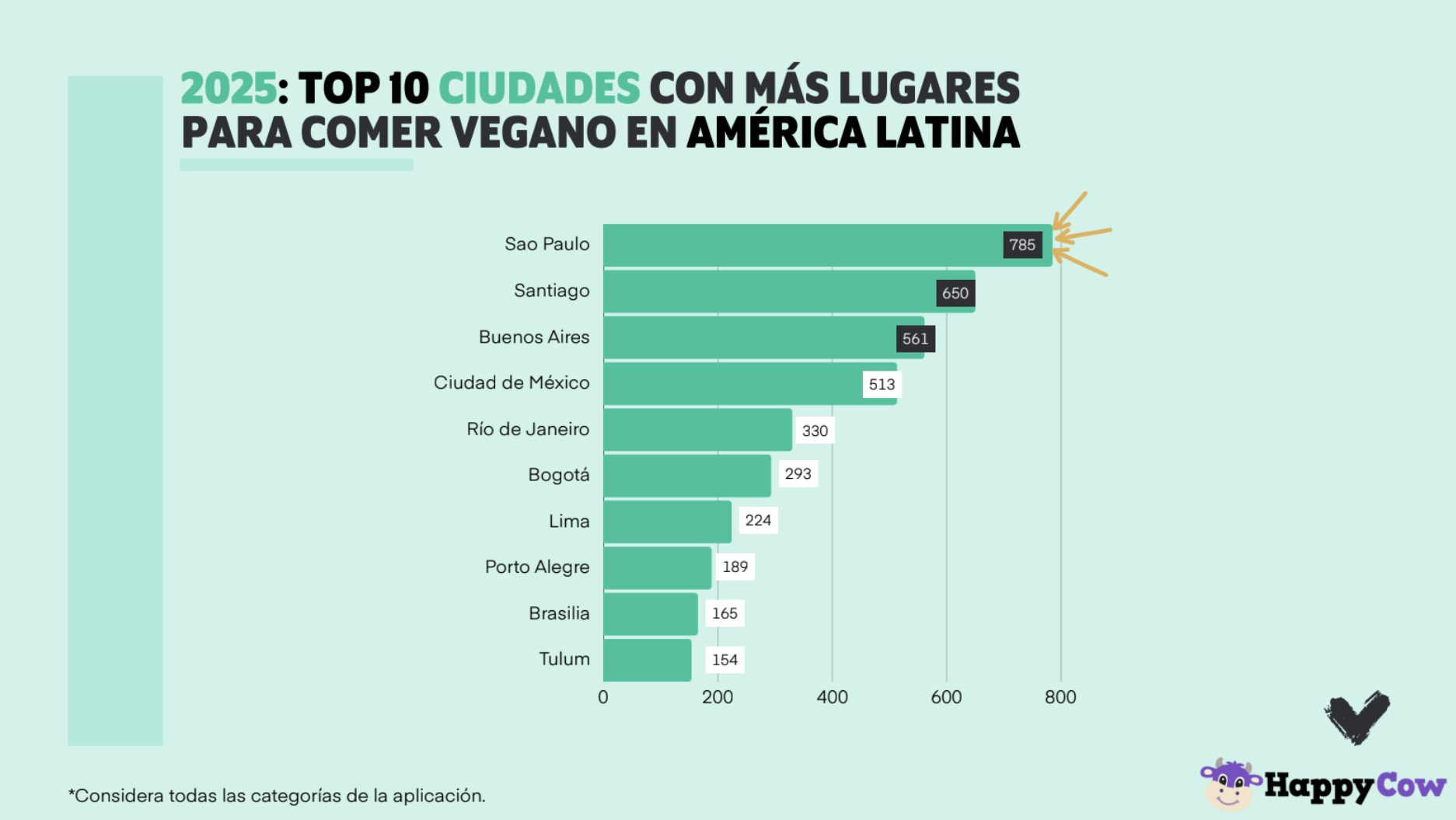 A nivel país, Chile se posiciona en el cuarto lugar del ranking latinoamericano, con 1.350 opciones veganas registradas y destaca además como uno de los mercados con mayor expansión. Entre 2023 y 2025, la oferta vegana en el país creció un 42,7%, mientras que Santiago lideró el crecimiento urbano con un alza de 44,4% en el mismo periodo.