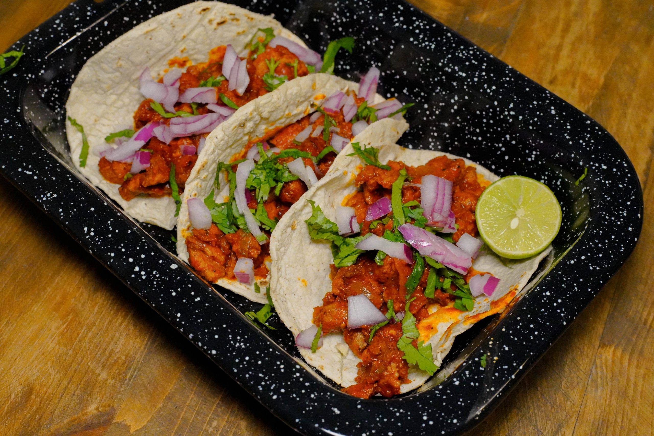 - Tacos de carne enchilada vegana, con textura y sabor inspirados en recetas clásicas.