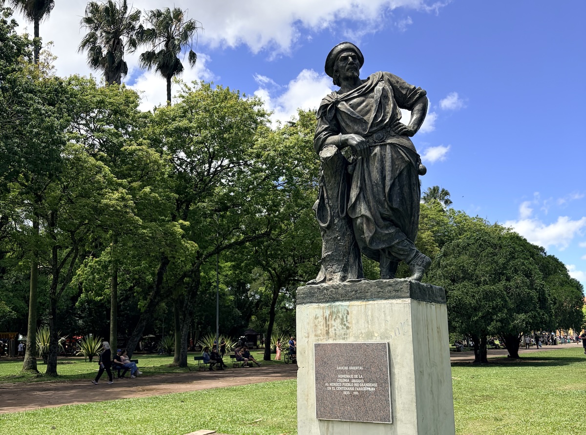 La figura del gaucho alcanza su máxima expresión en el Laçador, monumento que se convirtió en símbolo de Porto Alegre y síntesis de la identidad del sur brasileño. Otra figura está en el Parque Farroupilha, donde el Gaúcho Oriental —un regalo de la comunidad uruguaya— recuerda que la identidad gaúcha trasciende fronteras y forma parte de una cultura común en el sur del continente.