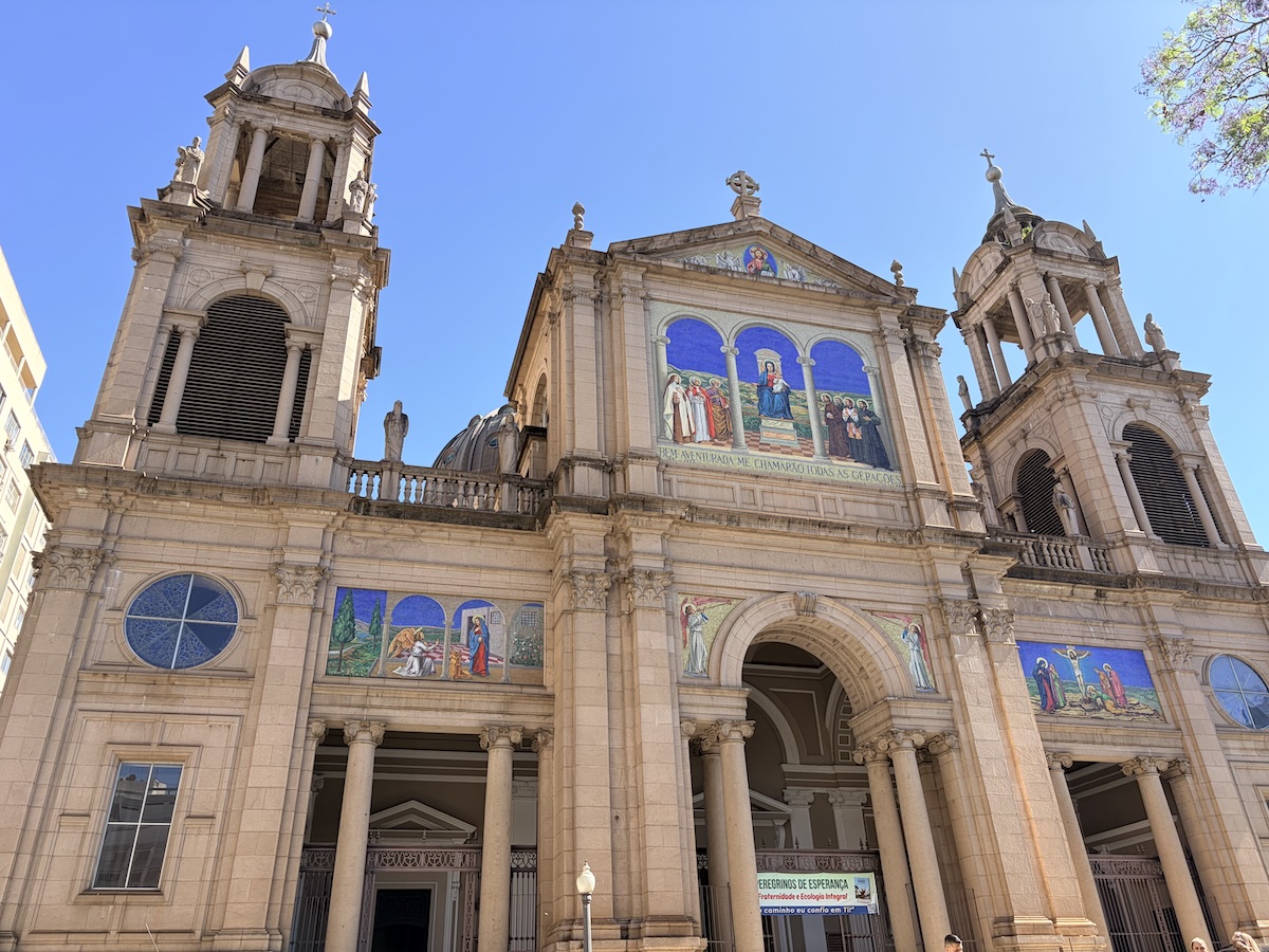 En ese mismo entorno se alza la Catedral Metropolitana de Porto Alegre, reconocible por su gran cúpula verde inspirada en el Renacimiento italiano. A su alrededor, pequeñas cafeterías invitan a hacer una pausa con vista al conjunto arquitectónico.