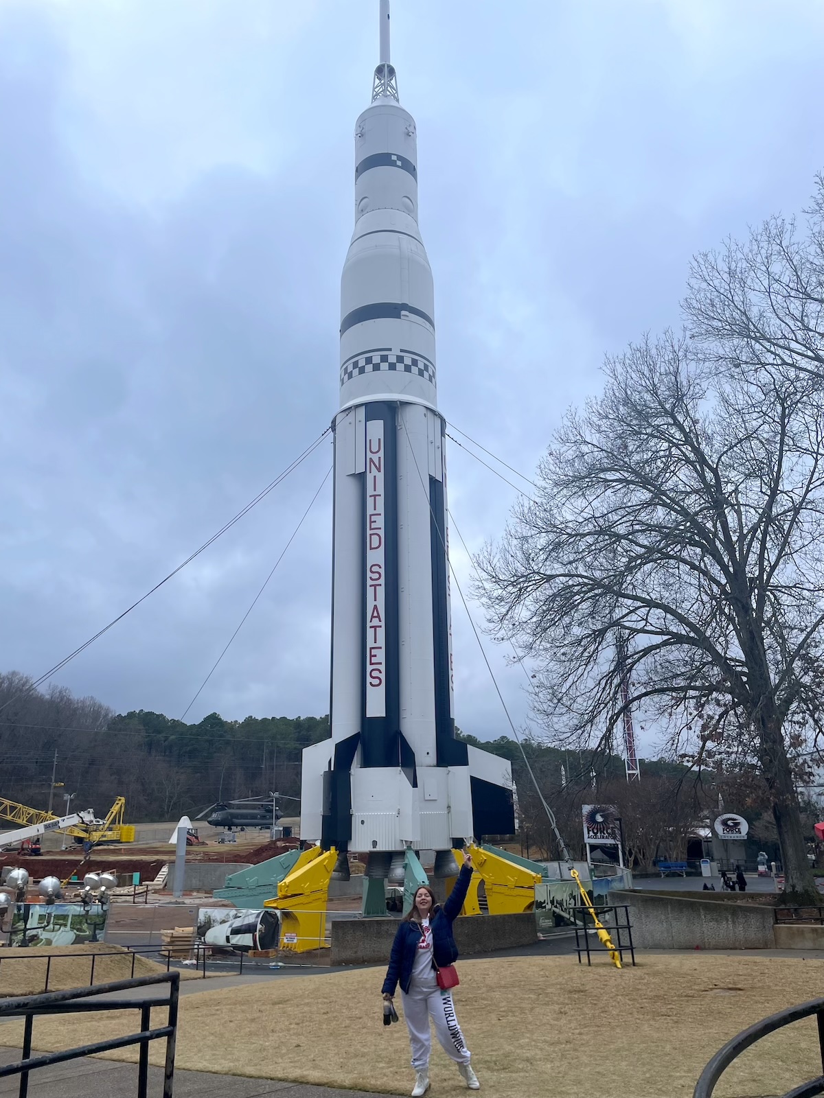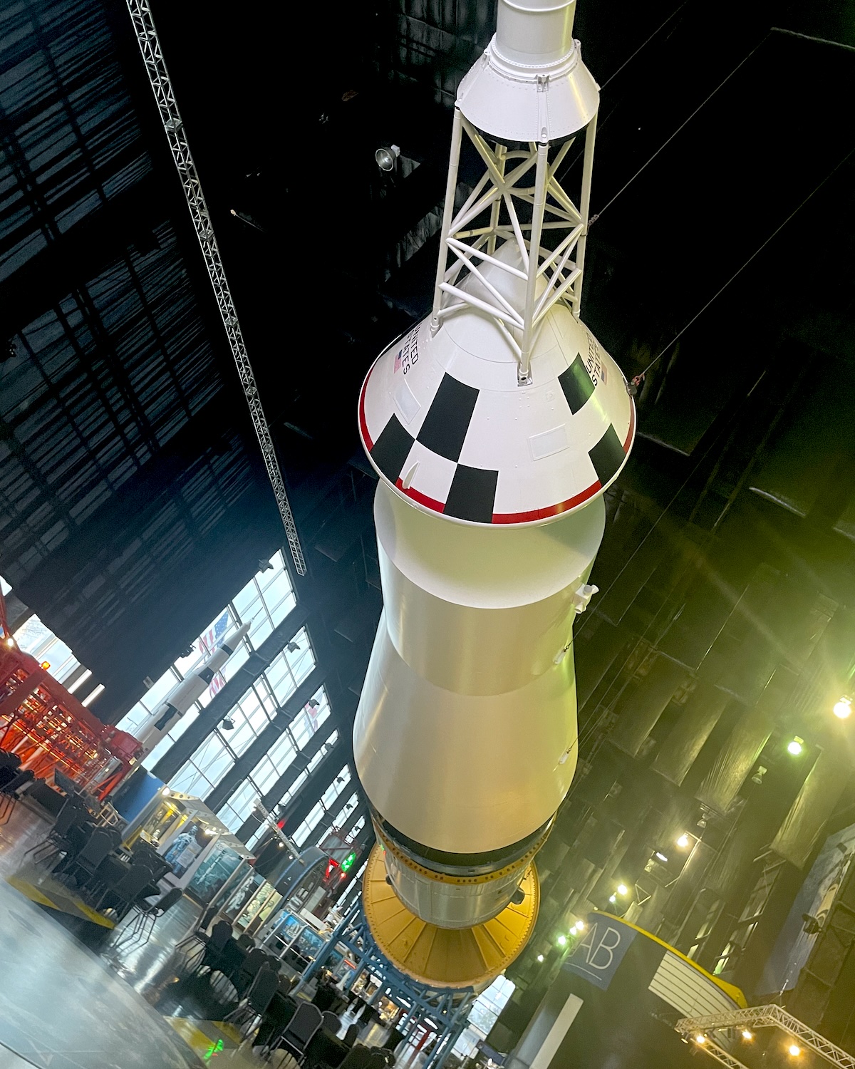 Al salir a la ciudad, un imponente cohete se levanta como postal permanente en una réplica del Saturn V construida en 1999 para conmemorar los 30 años del Apollo 11.