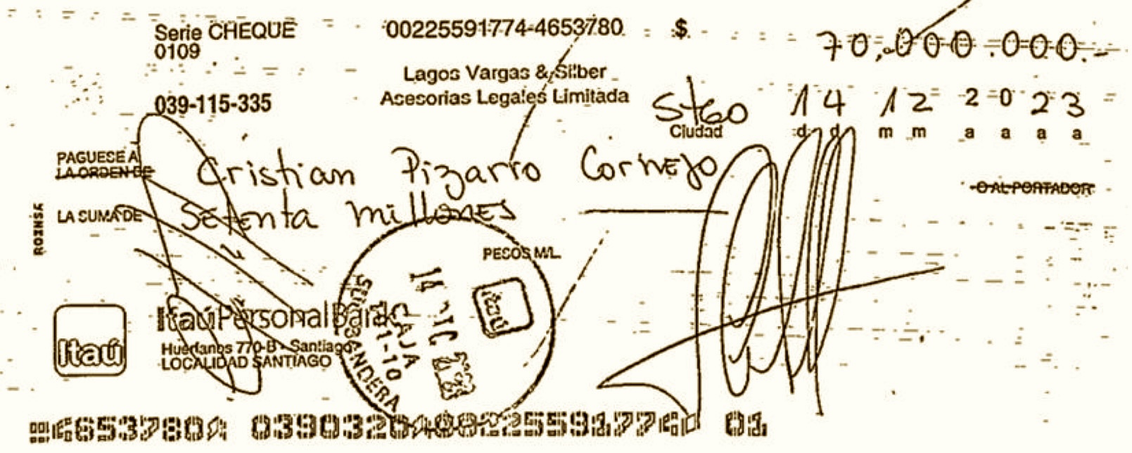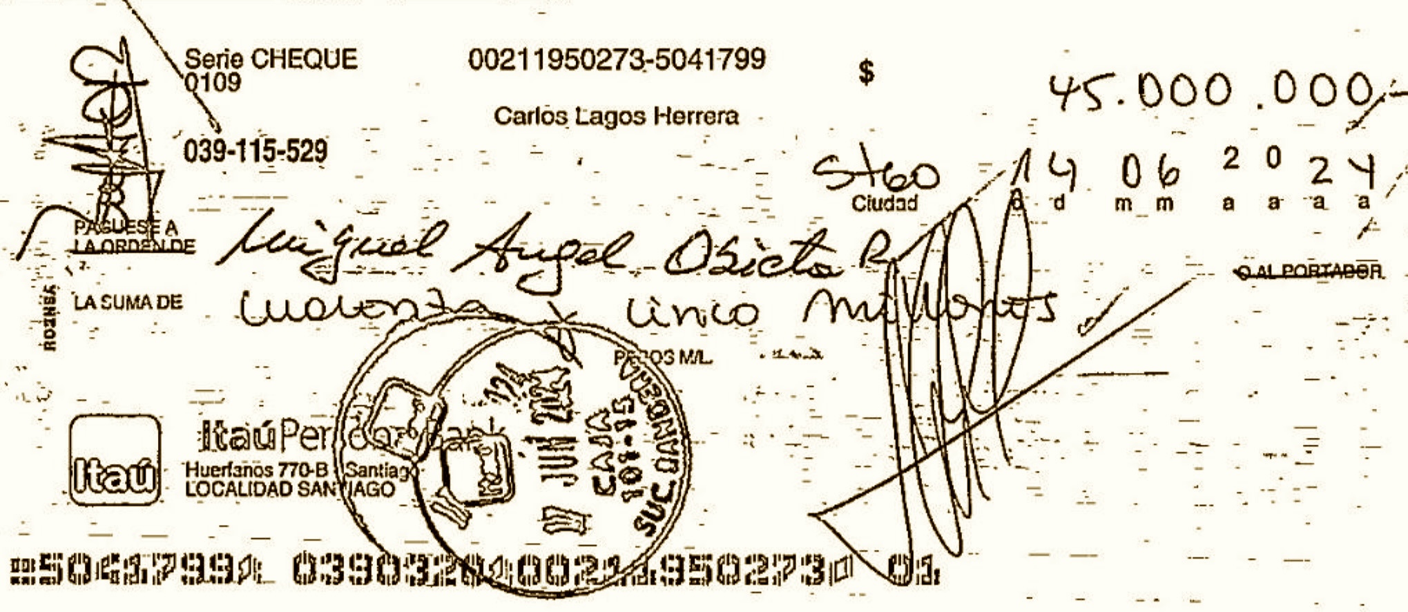 El 14 de junio de 2024, el abogado Lagos giró un cheque por 45 millones de pesos, “a fin de hacer la entrega del beneficio económico, por medio de Migueles Oteíza, a la ministra Vivanco”.