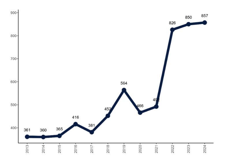En 2019 los casos subieron a 564 y bajaron en los dos años siguientes (lo que podría obedecer a la pandemia), pero se dispararon a partir de 2022, cuando hubo 826 casos. En 2023 fueron 850 y en 2024, 868. De estos delitos, la mayor cantidad pertenece a secuestros en los cuales “no hay antecedentes para definir motivación” (21.9% el año pasado), aunque fuentes policiales admiten que muchos de estos casos pueden obedecer a secuestros fallidos en los cuales no se llegó a cobrar rescate.