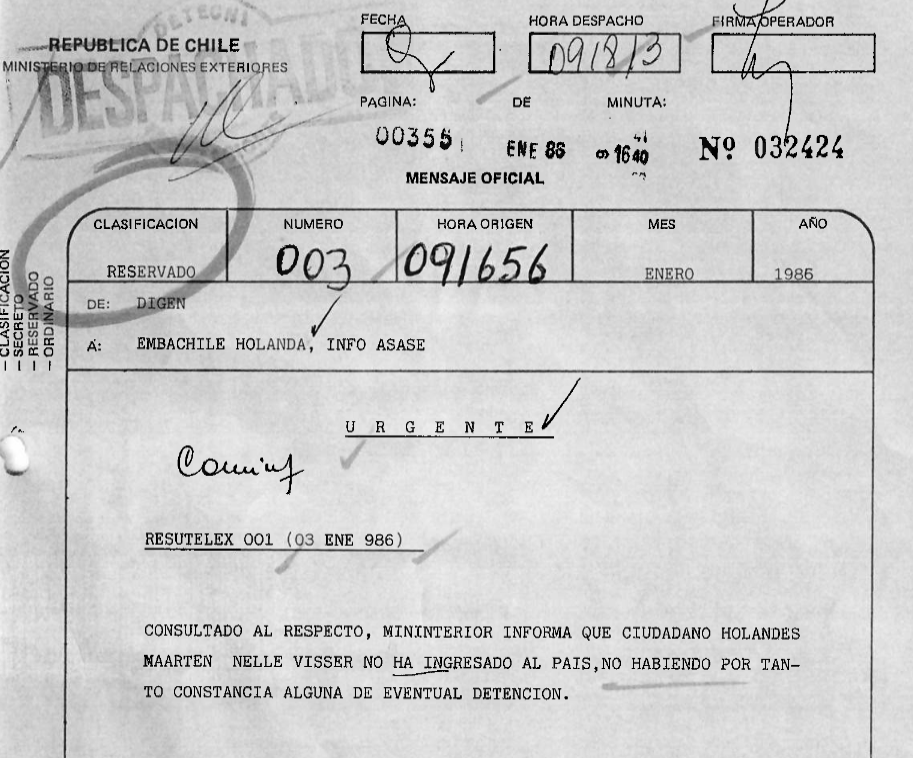 Y aquí viene lo más sorprendente: la Cancillería entregó solo un set de documentación, que se compone de dos mensajes. El primero de ellos fue enviado desde la embajada chilena en Holanda el 03 de enero de 1986 (es decir, unas semanas después) y tiene los timbres de “urgente” y “reservado”. Como referencia, señala “Desaparición joven holandés”.