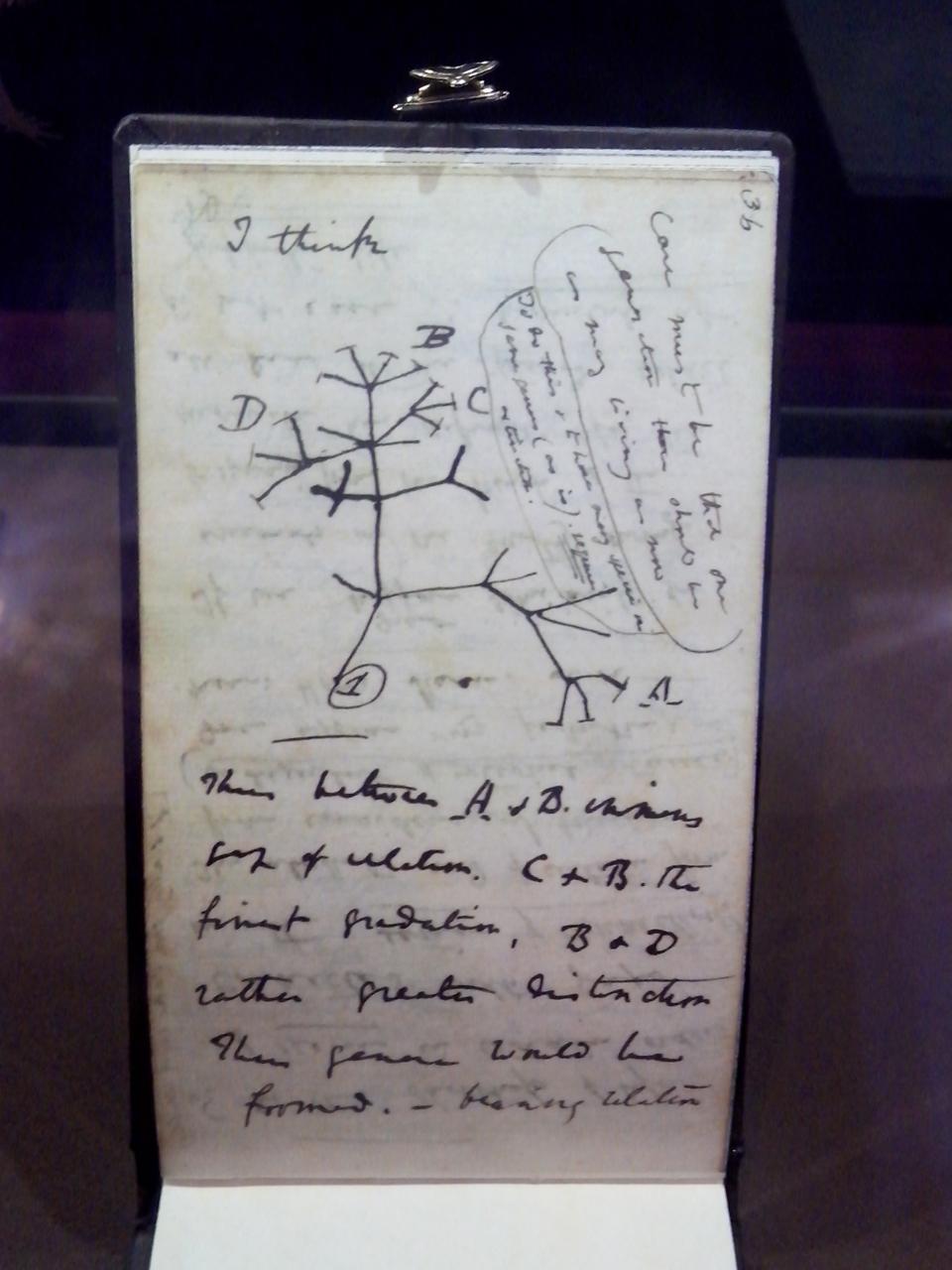 “Por lo tanto, entre A y B inmenso vacío de relación; C y B la mejor gradación; B y D bastante más diferencia. Por lo tanto, los géneros se formarían guardando relación con tipos antiguos con varias formas extinguidas” (traducción de Carlos Vera, Museo Virtual de Ecología Humana).