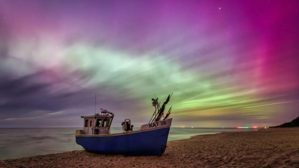 Auroras en latitudes inusuales provocadas por una tormenta solar extrema, resultado de la interacción entre partículas solares y el campo magnético terrestre.