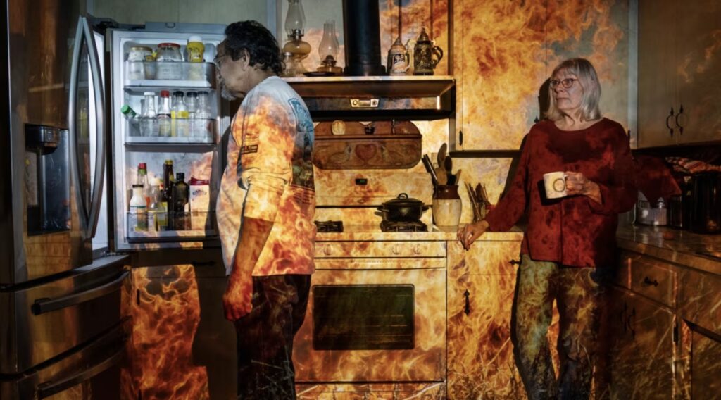 En este contexto, los fotógrafos italianos Edoardo Delille y Giulia Piermartiri crearon el fotolibro Atlas of the New World, del cual proviene la “Imagen de la Semana” en Universo Paralelo. Se trata de una composición de carácter surrealista, construida mediante montaje análogo, que imagina cómo se transforman comunidades y territorios frente a los efectos del cambio climático. En particular, la imagen retrata la convivencia cotidiana con incendios forestales, una problemática que vuelve a manifestarse de manera crítica en nuestro país.