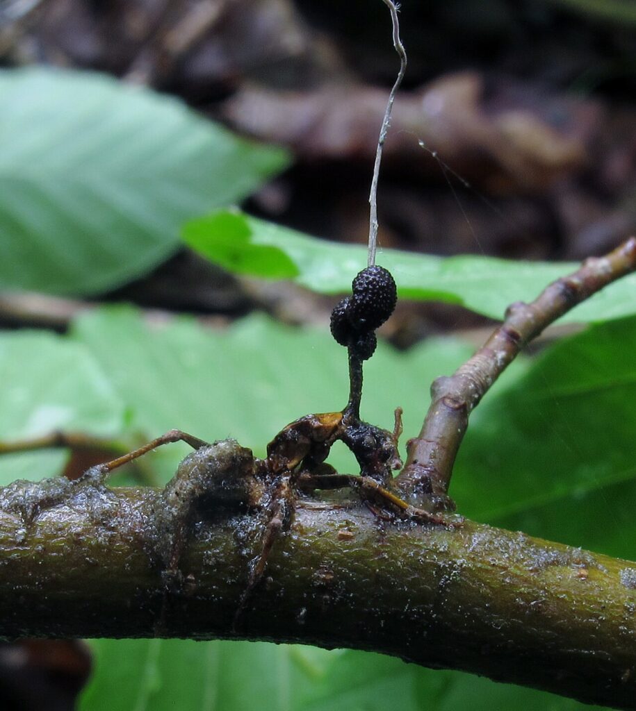 En ese punto, el hongo consume gradualmente el cuerpo de la hormiga y desarrolla una estructura llamada estroma, que emerge desde la cabeza del insecto y permite la dispersión de nuevas esporas, tal como se observa en la imagen.