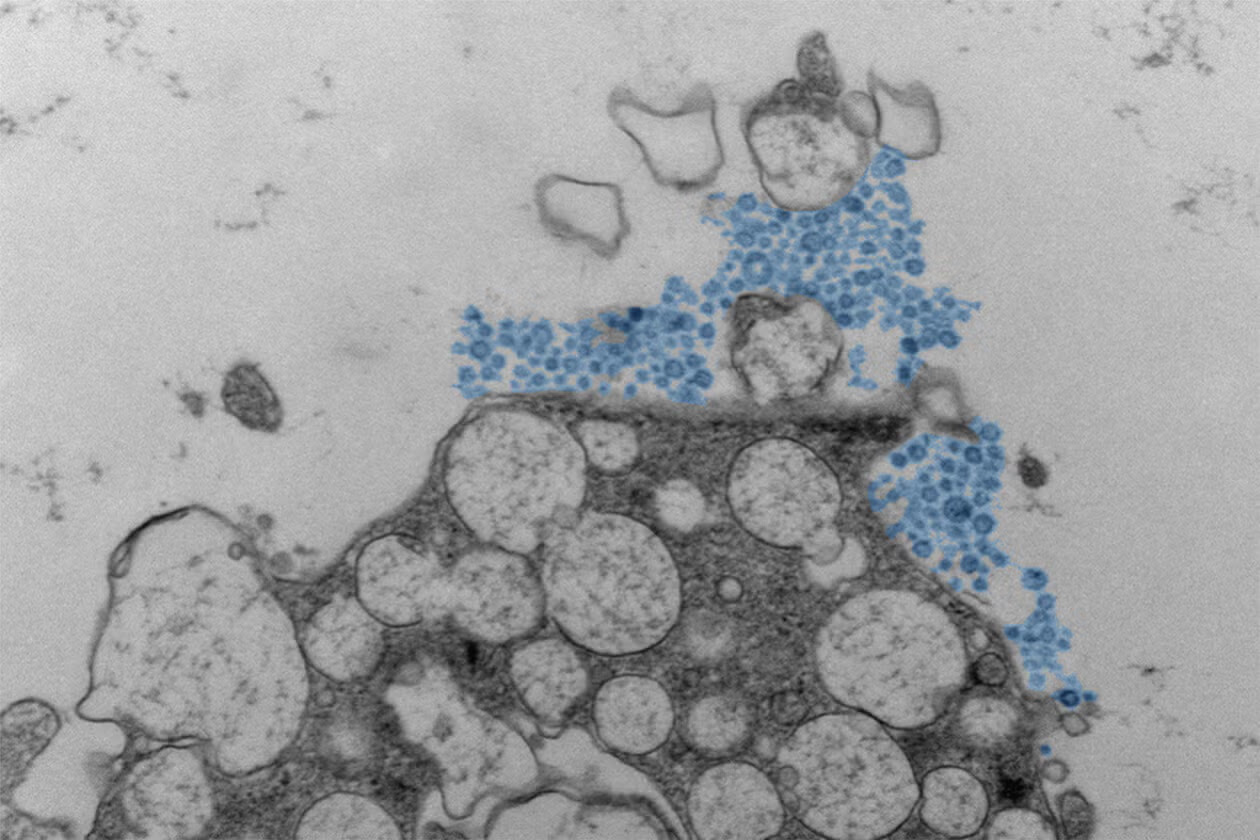 Micrografía electrónica que muestra una célula epitelial nasal humana liberando rinovirus (en azul). Crédito: Julien Amat, Bao Wang. Fuente: Yale News.